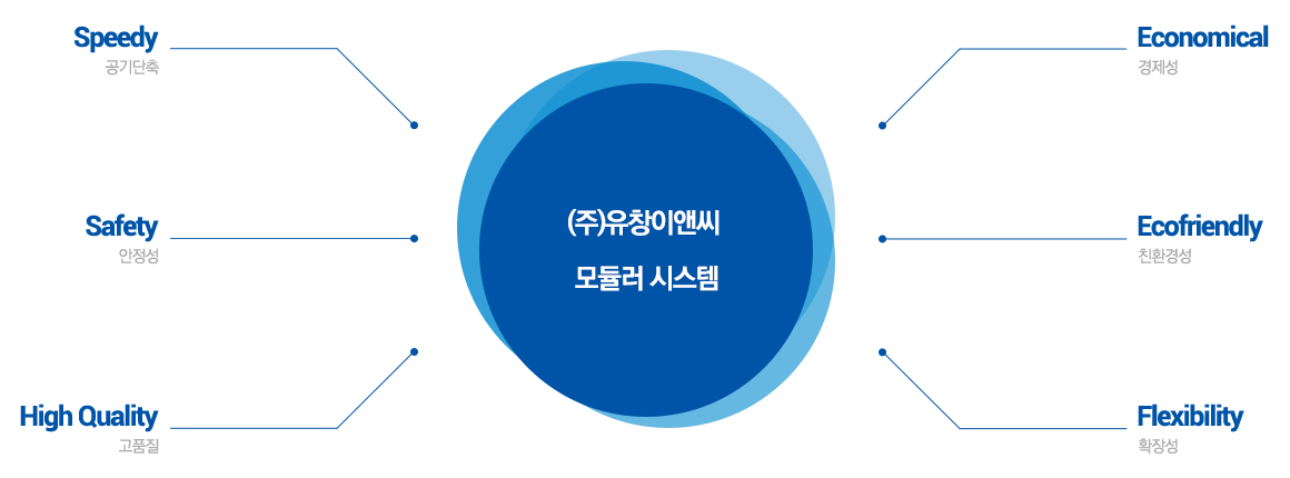 ㈜유창이앤씨의 모듈러는 획기적인 공기단축 및 친환경 공법을 인정받아 건설교통부 신기술 제435호로 지정된 차별화된 건축시스템으로, 오피스, 주거시설, 학교시설, 군사시설, 기숙사 등 널리 적용되고 있습니다. 모듈러시스템 건축은 공장에서 80% 이상 제작된 단위 모듈유니트를 현장으로 운반 후 조립하여 완성하는 공업화 건축공법으로 공장제작을 통한 균일한 품질 확보와 생산비 및 시공비에 있어 탁월한 절감효과를 나타냅니다.